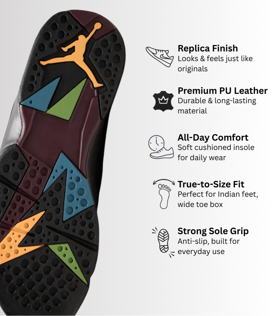 The Nike Air Jordan Retro 7 Hare replica delivers authentic style with a 10A quality finish that replicates the original’s look and feel. Crafted from premium PU leather, this shoe is both durable and long-lasting. It features a soft, cushioned insole designed for all-day comfort, while the wide toe box ensures a true-to-size fit tailored for Indian feet. The strong sole grip enhances stability with an anti-slip design, making it ideal for everyday wear without compromising on style or performance.